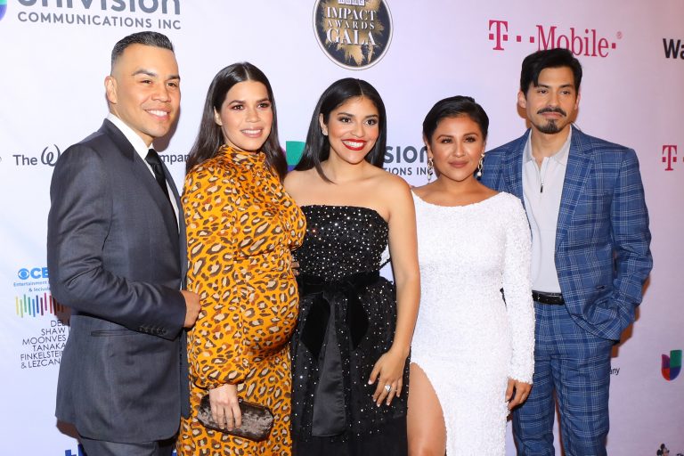 BEVERLY HILLS, CALIFORNIA – FEBRUARY 28: (L-R) J.J. Soria, America Ferrera, Karrie Martin, Annie Gonzalez, and Carlos Santos attend the 23rd Annual NHMC Impact Awards Gala at the Beverly Wilshire Four Seasons Hotel on February 28, 2020 in Beverly Hills, California. (Photo by JC Olivera/Getty Images for National Hispanic Media Coalition )