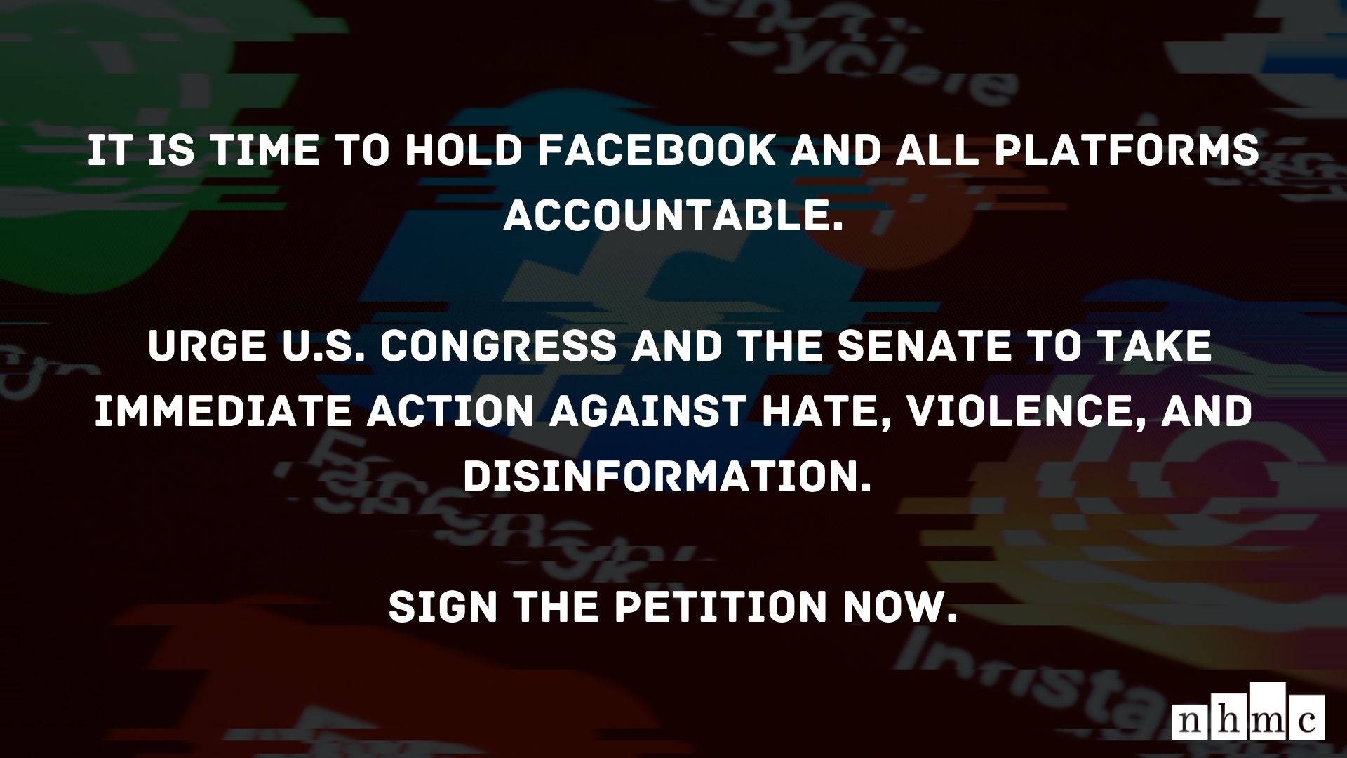 NHMC urges Congress to take immediate action against hate, violence, and disinformation, and hold Facebook and all platforms accountable through transparency requirements and the creation of a new regulatory government body. It is clear that Facebook cannot self-regulate, and for the sake of our children and the general public: Congress must act.
