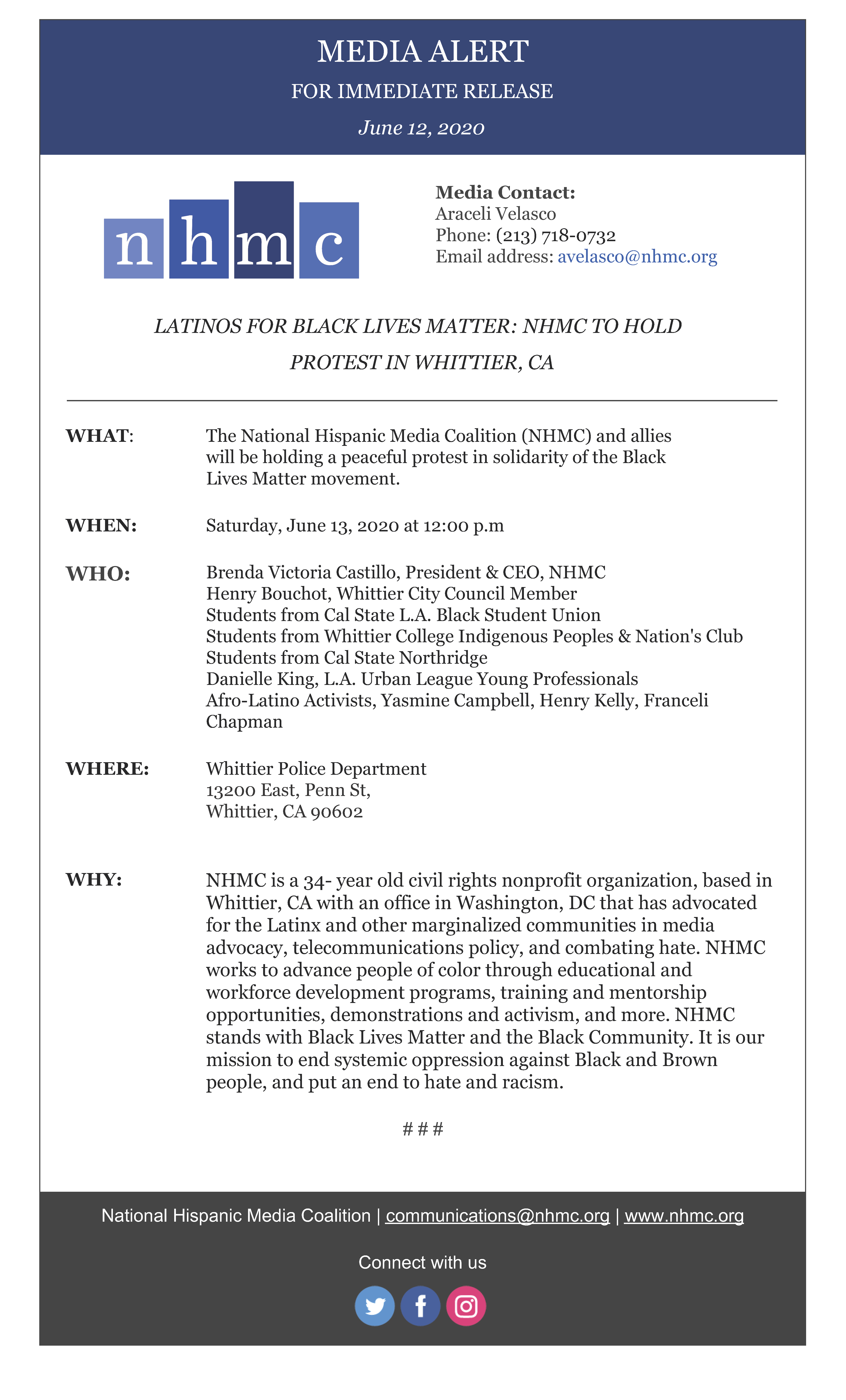 MEDIA ALERT: NHMC TO HOLD PEACEFUL PROTEST IN WHITTIER IN SOLIDARITY OF #BLACKLIVESMATTER