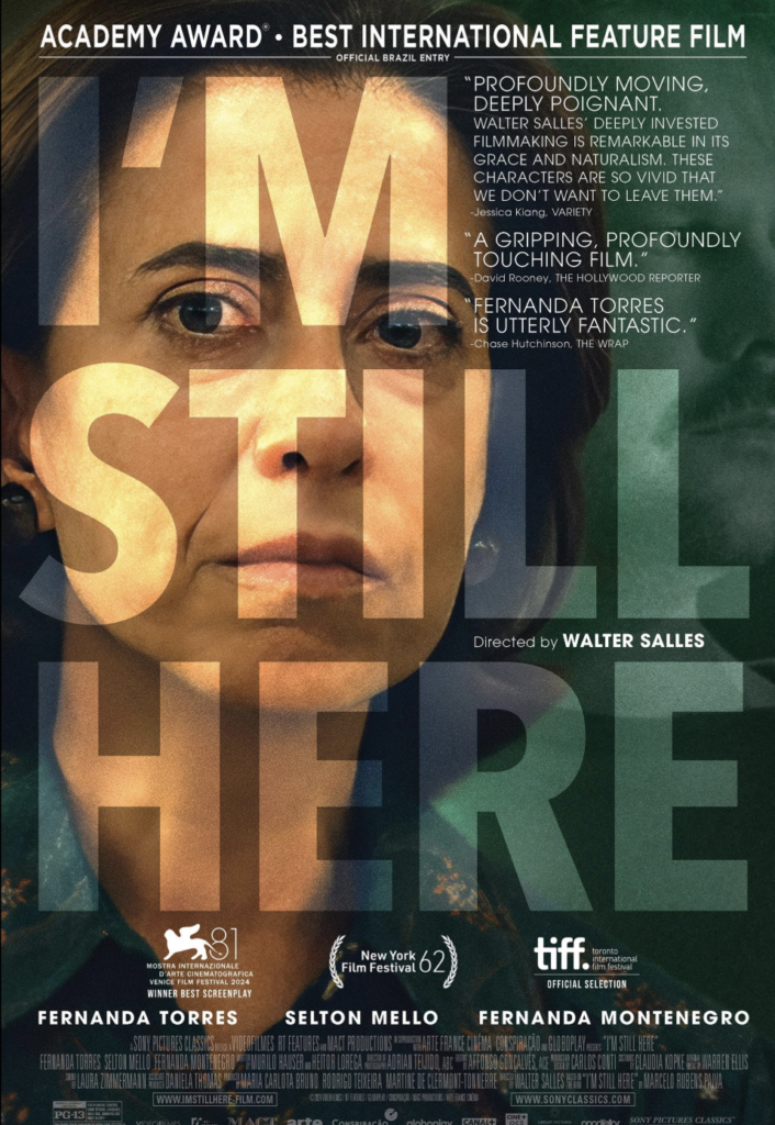 I’m Still Here is a powerful and moving drama that delves into the reality of Brazil’s military dictatorship in 1971 through the eyes of Eunice Paiva, a mother and activist. Brought to life by Brazillian director  Walter Salles, this film features outstanding performances by Fernanda Torres, Fernanda Montenegro, and Sellton Mello.