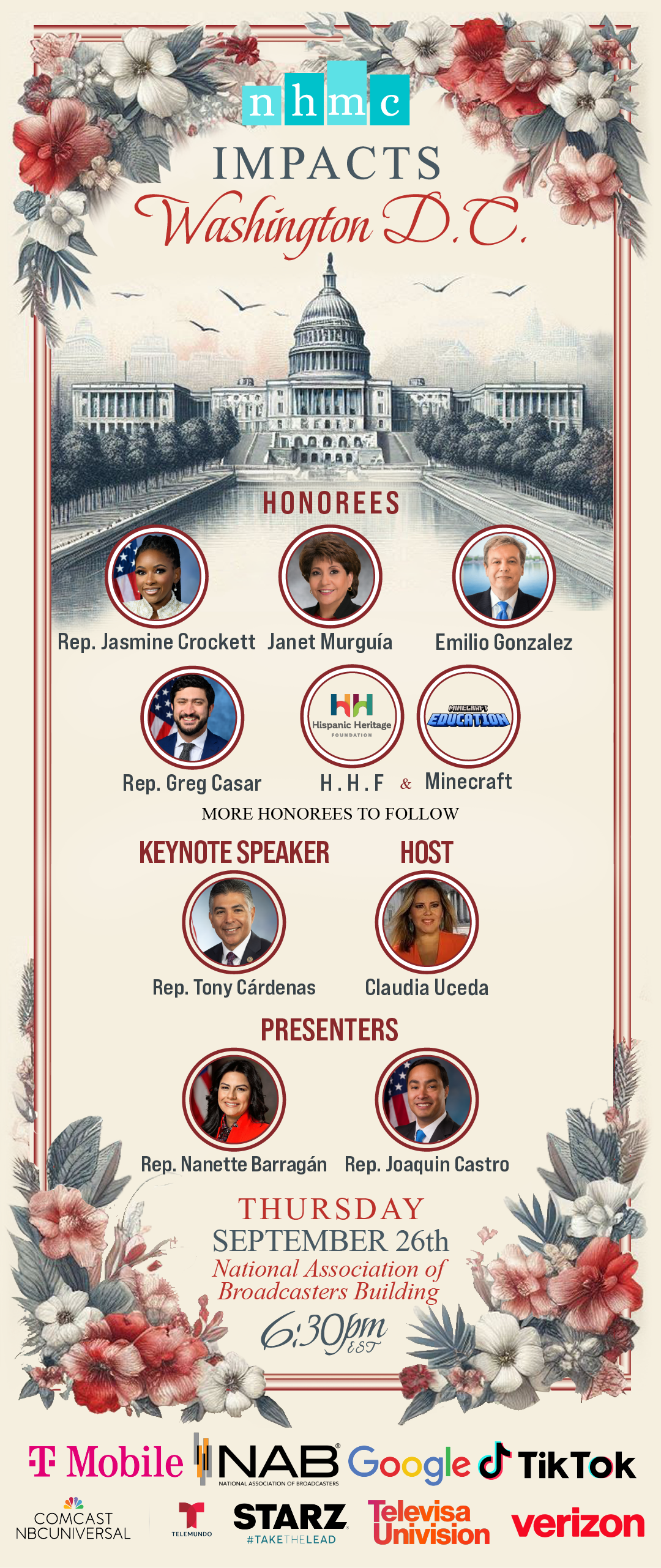 NHMC applauds its sponsors for the partnership and commitment to the NHMC Impacts Washington, D.C. reception. Sponsors include Google, Verizon, Comcast, T-Mobile, TikTok, Starz, Nielsen, and the National Association of Broadcasters.