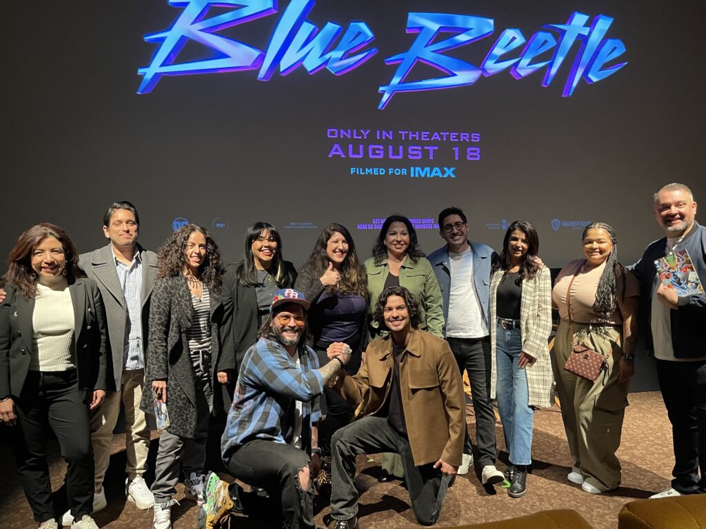 From left bottom: Director Ángel Manuel Soto, Actor Xolo Maridueña & NHMC and other Latine organizations supporting the trailer of Blue Beetle