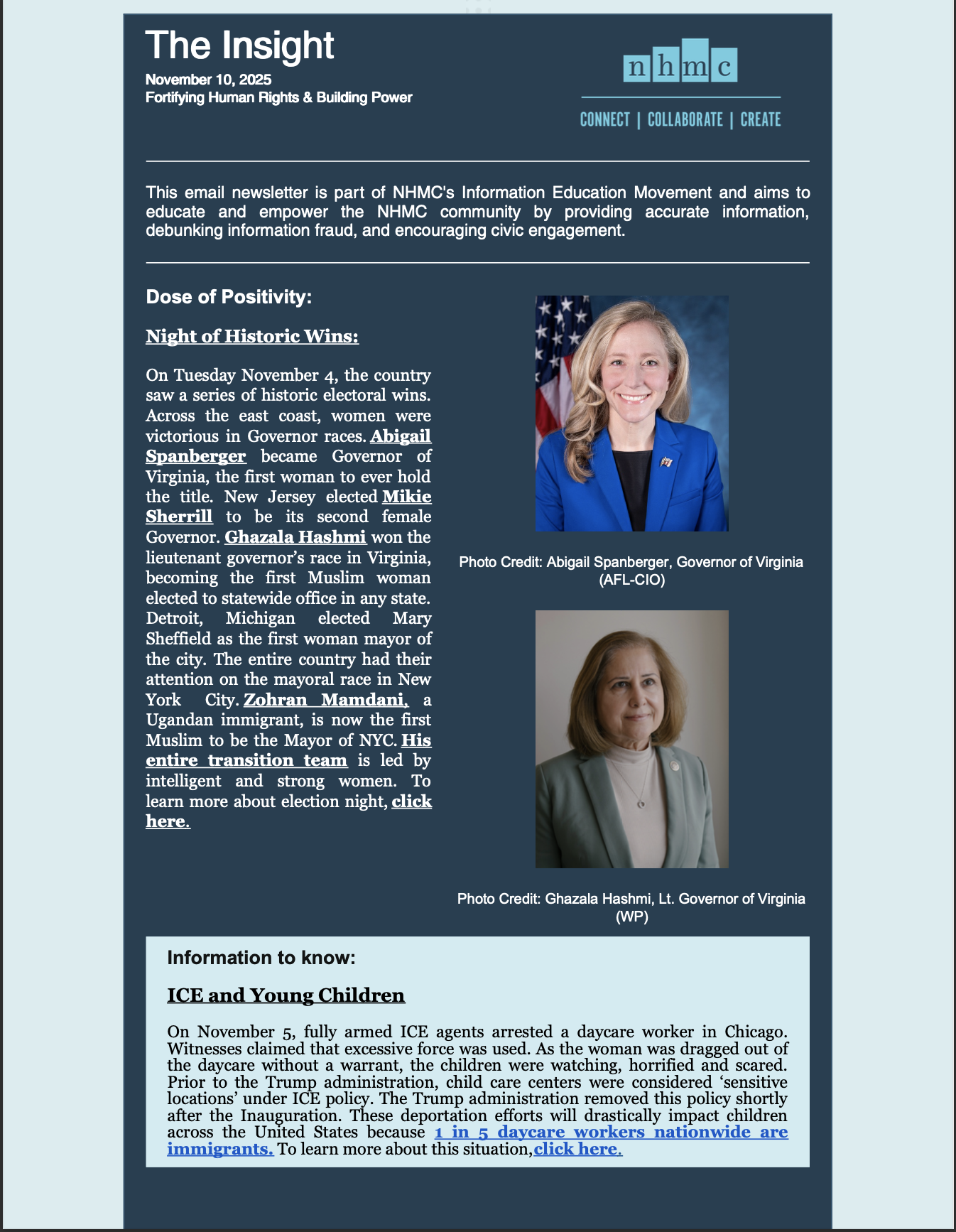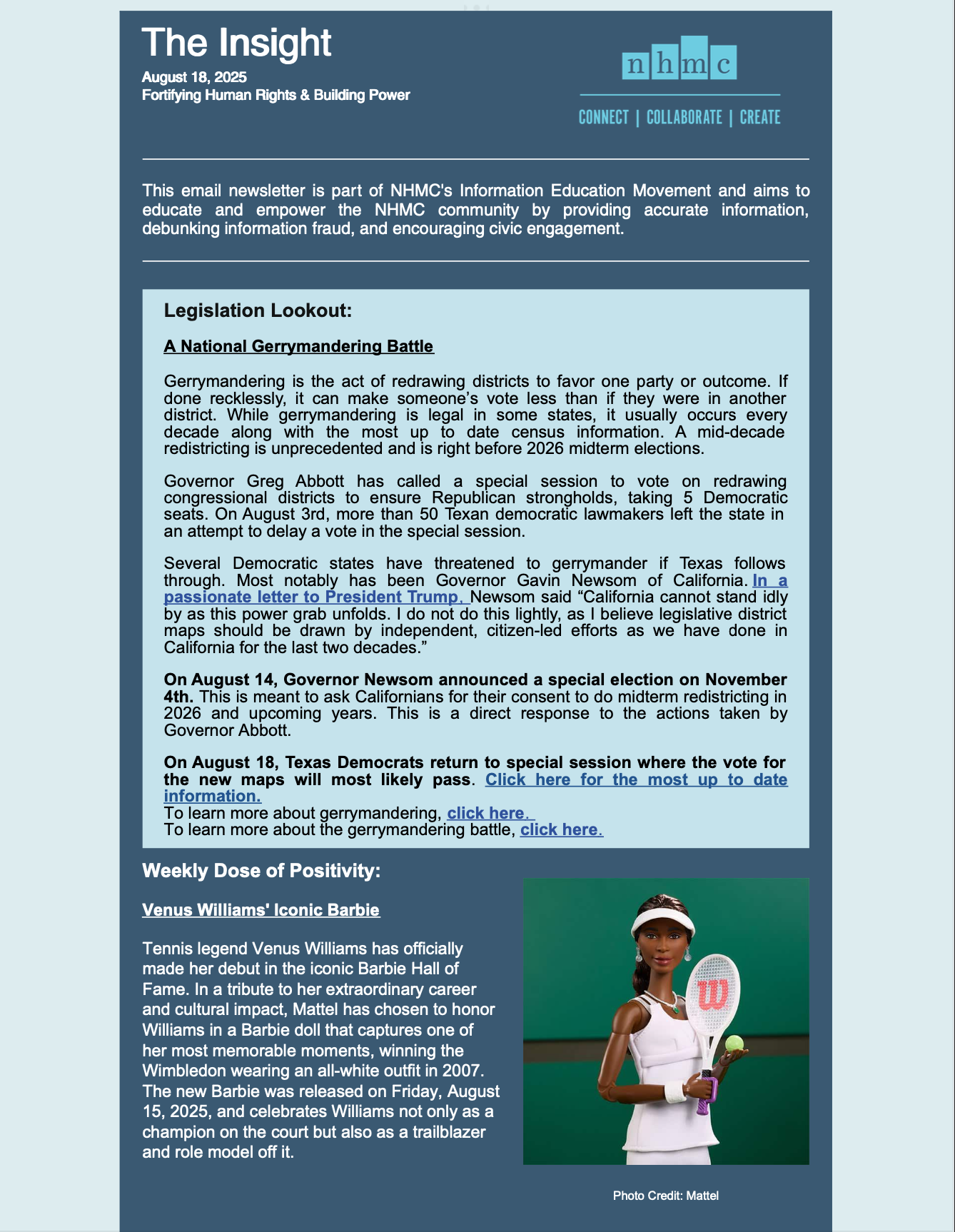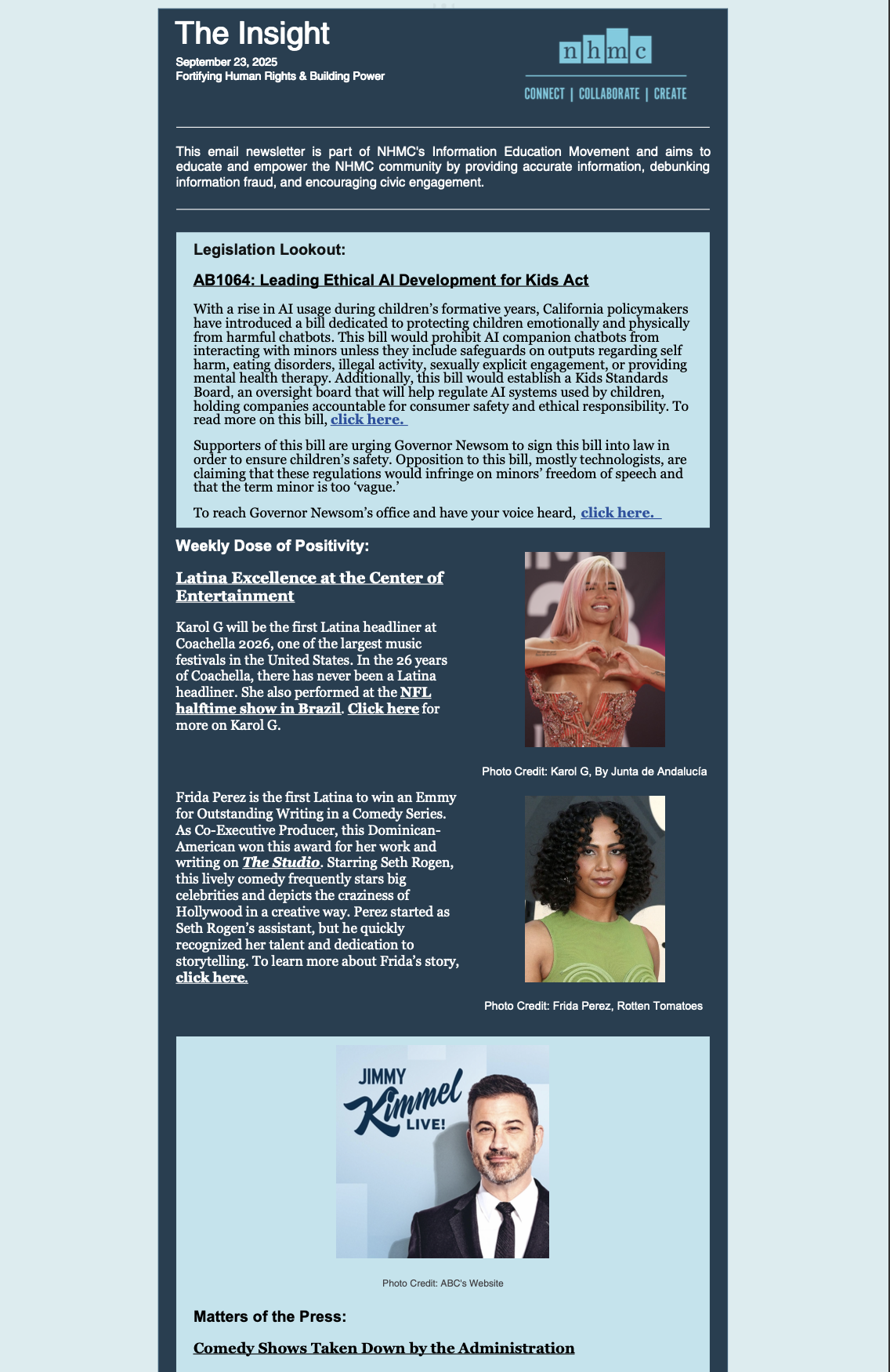 The weekly email newsletter is part of NHMC’s Information Education Movement and aims to educate and empower the NHMC community by providing accurate information, debunking information fraud, and encouraging civic engagement. It will be a trusted resource for individuals passionate about fighting information fraud and staying informed on critical developments in policy, culture, and advocacy.